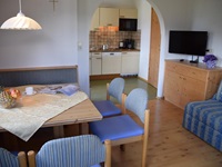 (vier-Platten-Kochherd, Dunstabzug, Mikrowelle, Geschirrspülmaschine, Filter-Kaffeemaschine, Wasserkocher, sämtliches Geschirr etc.) Wohn-Schlafraum mit Tisch-Ecke und Sitzecke